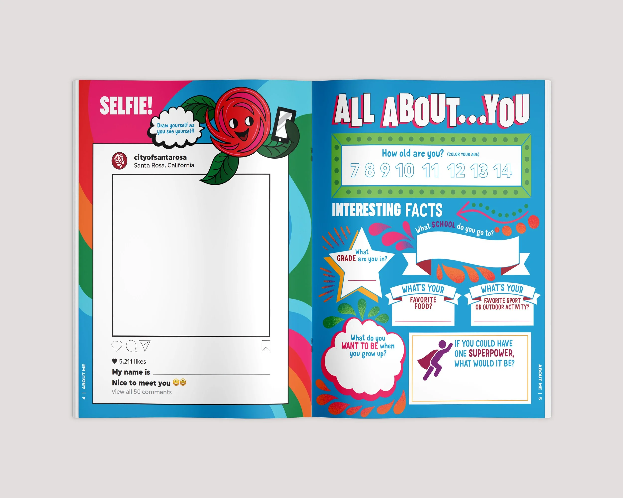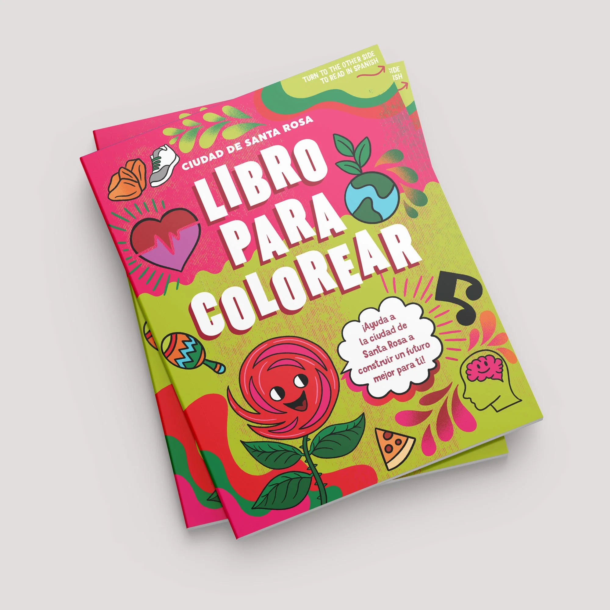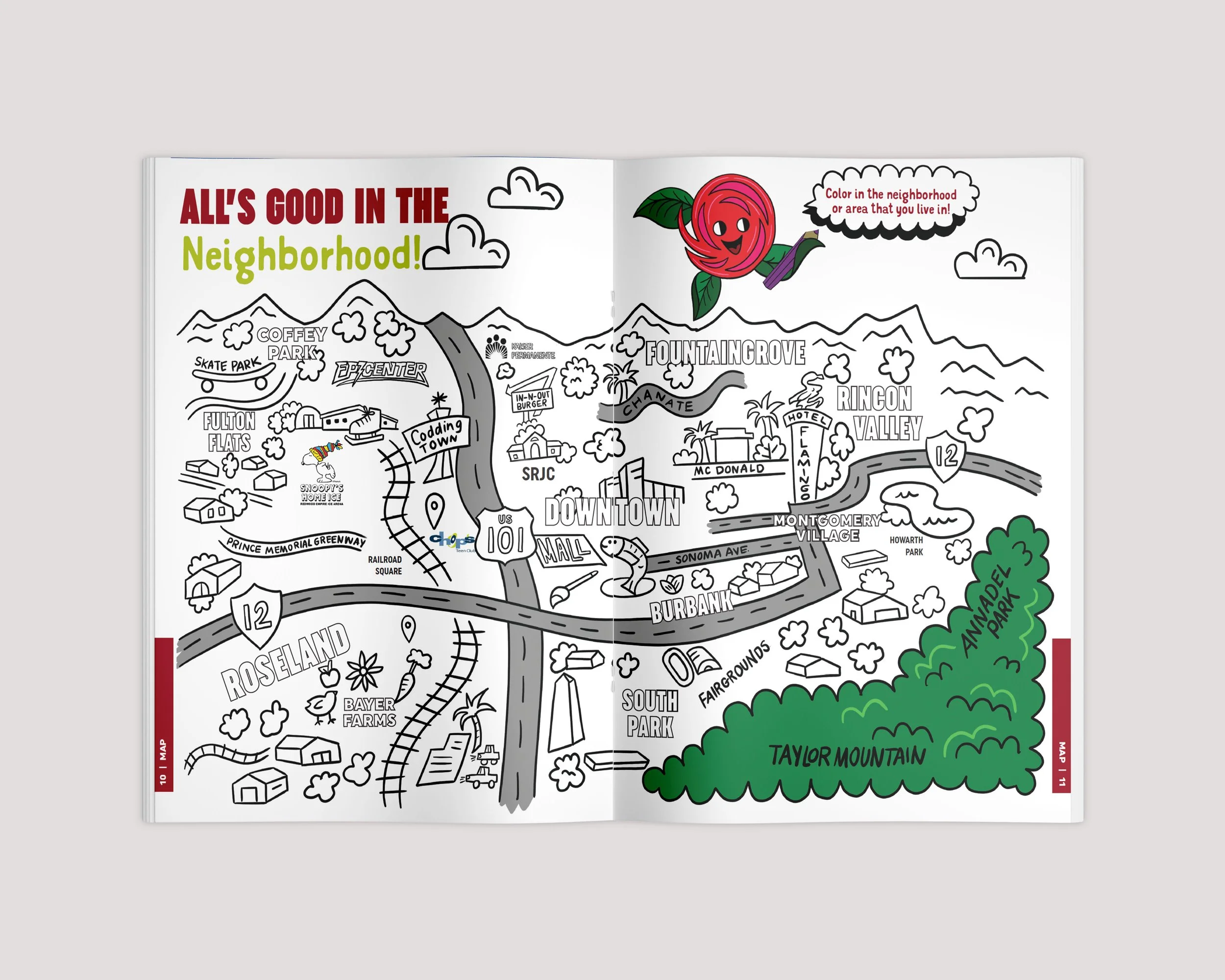 Fun coloring book I designed and illustrated for the City of Santa Rosa. The purpose of the coloring book was to target local kids from ages 7-14 and have them answer a series of questions about themselves and of what they would like to see in the future of Santa Rosa. About 800 bilingual books were printed and distributed to the schools in Santa Rosa to gather data.